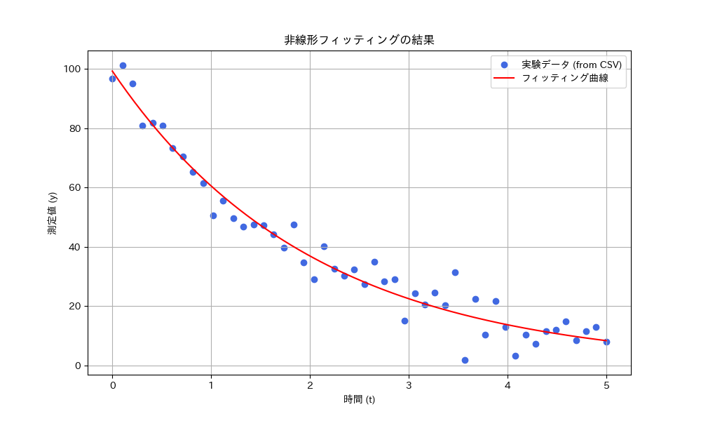 準備が整ったら、curve_fit関数にモデル関数と読み込んだデータを渡してフィッティングを実行します。得られた最適パラメータを使って、元のデータとフィット曲線を重ねてプロットし、結果を視覚的に確認します。